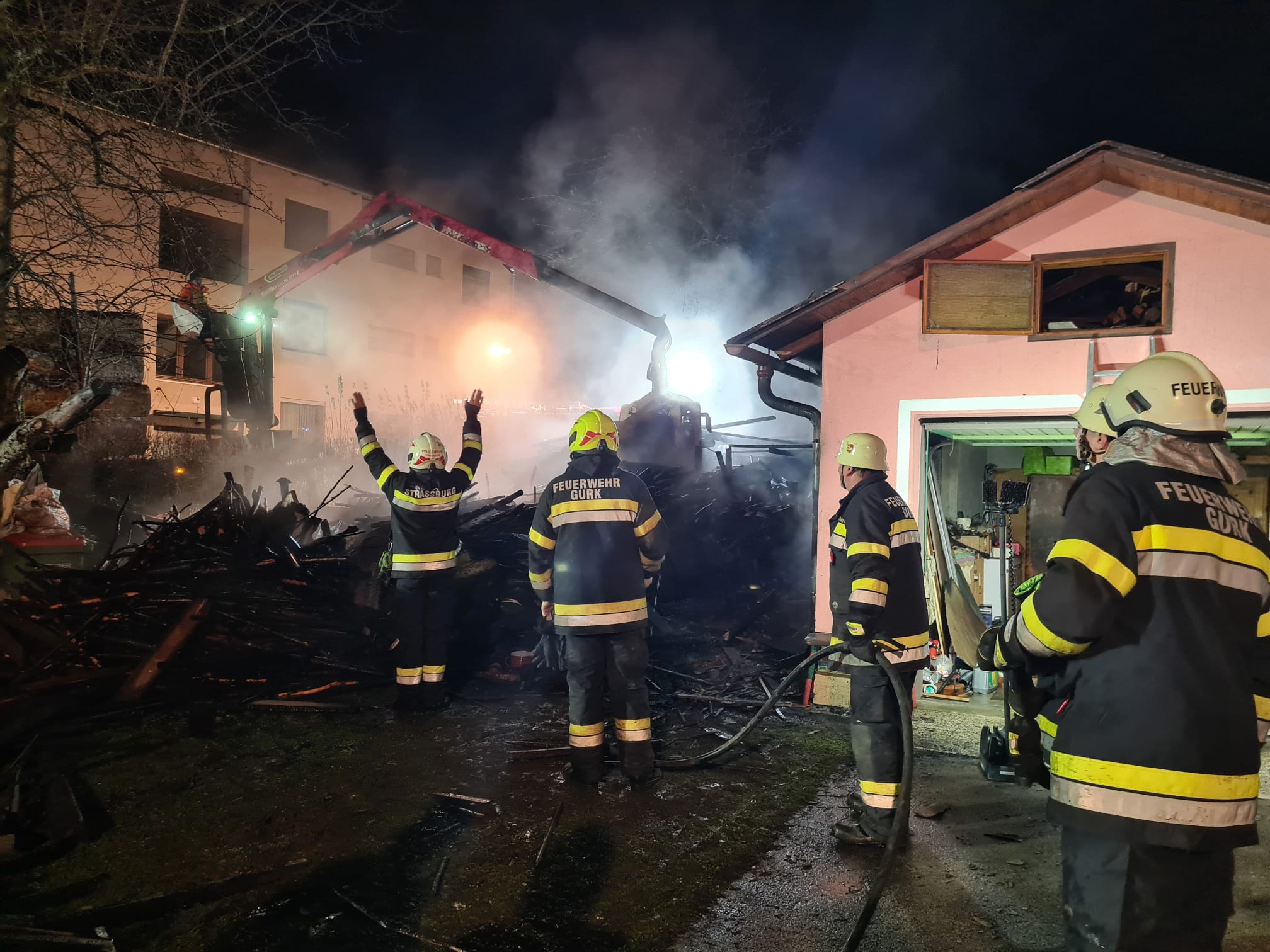 Als die Einsatzkräfte am Einsatzort eintrafen stand das Nebengebäude bereits in Vollbrand. Unter schwerem Atemschutz wurde durch ATS-Trupps der Feuerwehren Gurk und Straßburg umgehend ein umfassender Löschangriff mittels Hochdruck-Schnellangriffseinrichtung vorgenommen. Der Großteil des Holzlagerbestandes wurde ein Raub der Flammen. Ein übergreifen der Flammen auf das angrenzende Wohnhaus konnte durch das rasche Eingreifen der Einsatzkräfte verhindert werden. Ein Teil der ebenfalls angrenzenden Garage wurde beschädigt. Das Dach des Holzlagers wurde abgedeckt und zur Unterstützung der Nachlöscharbeiten wurde ein Kran eines privaten Holzunternehmens angefordert. Glücklicherweise wurden keine Personen verletzt.