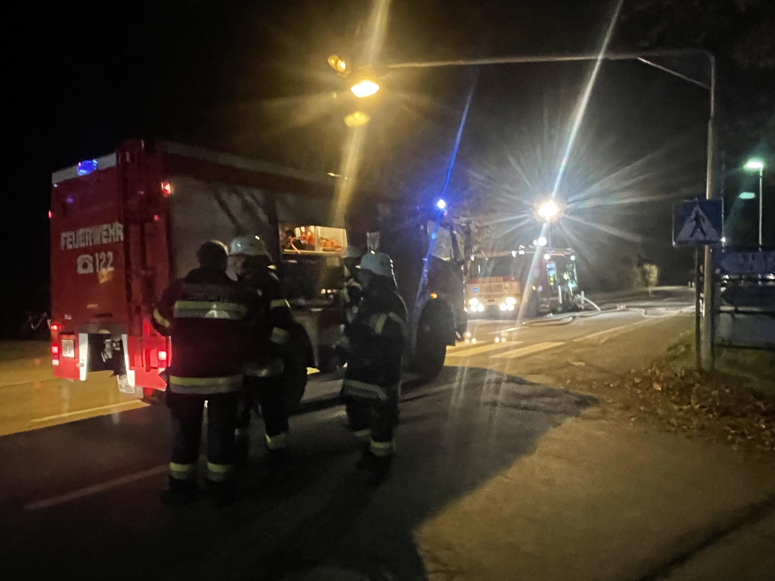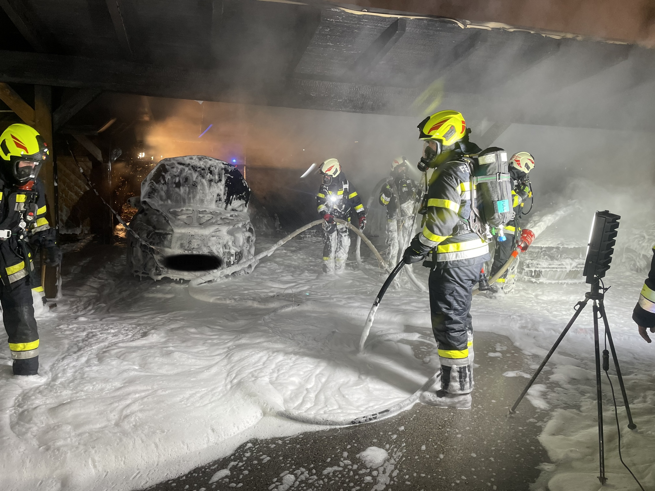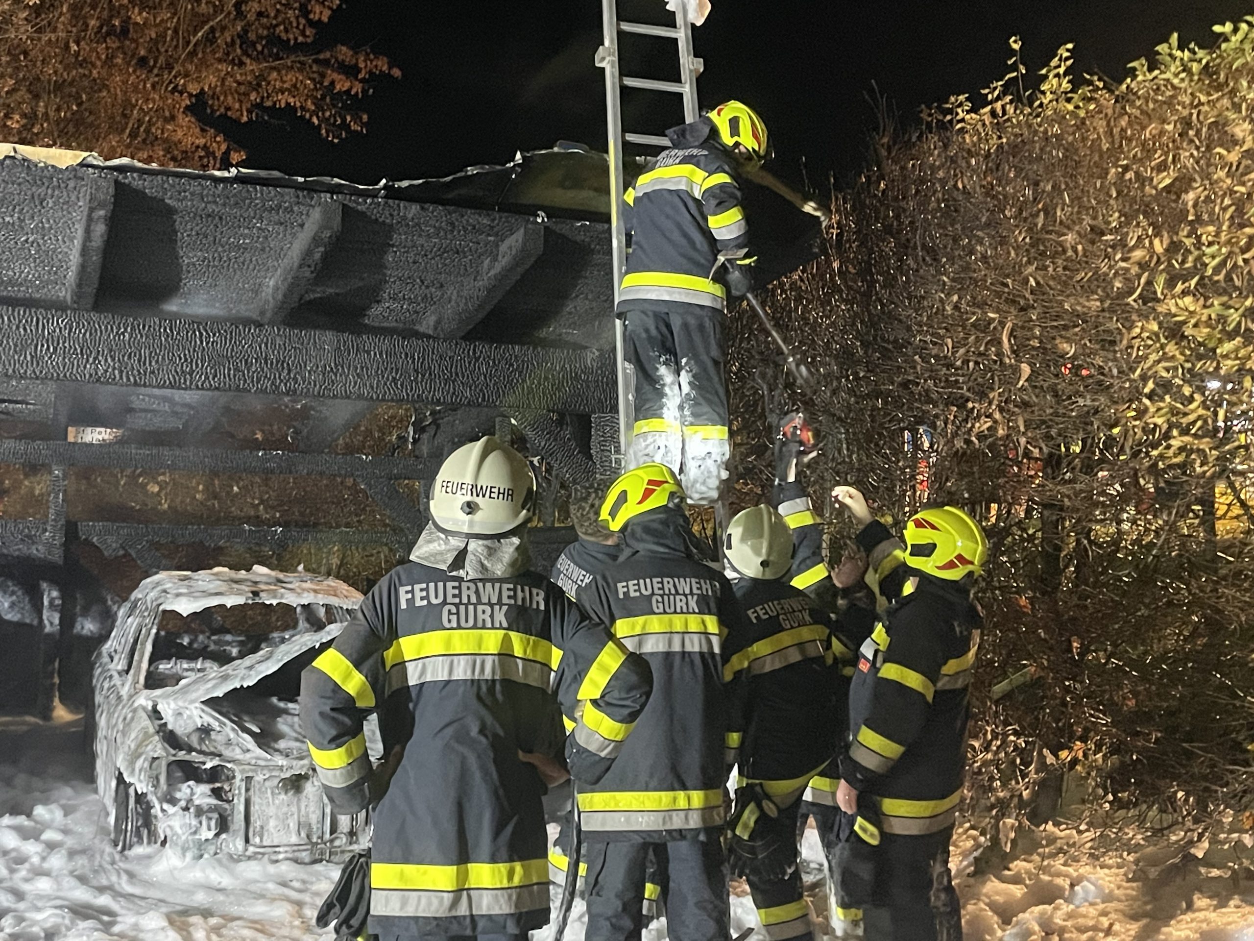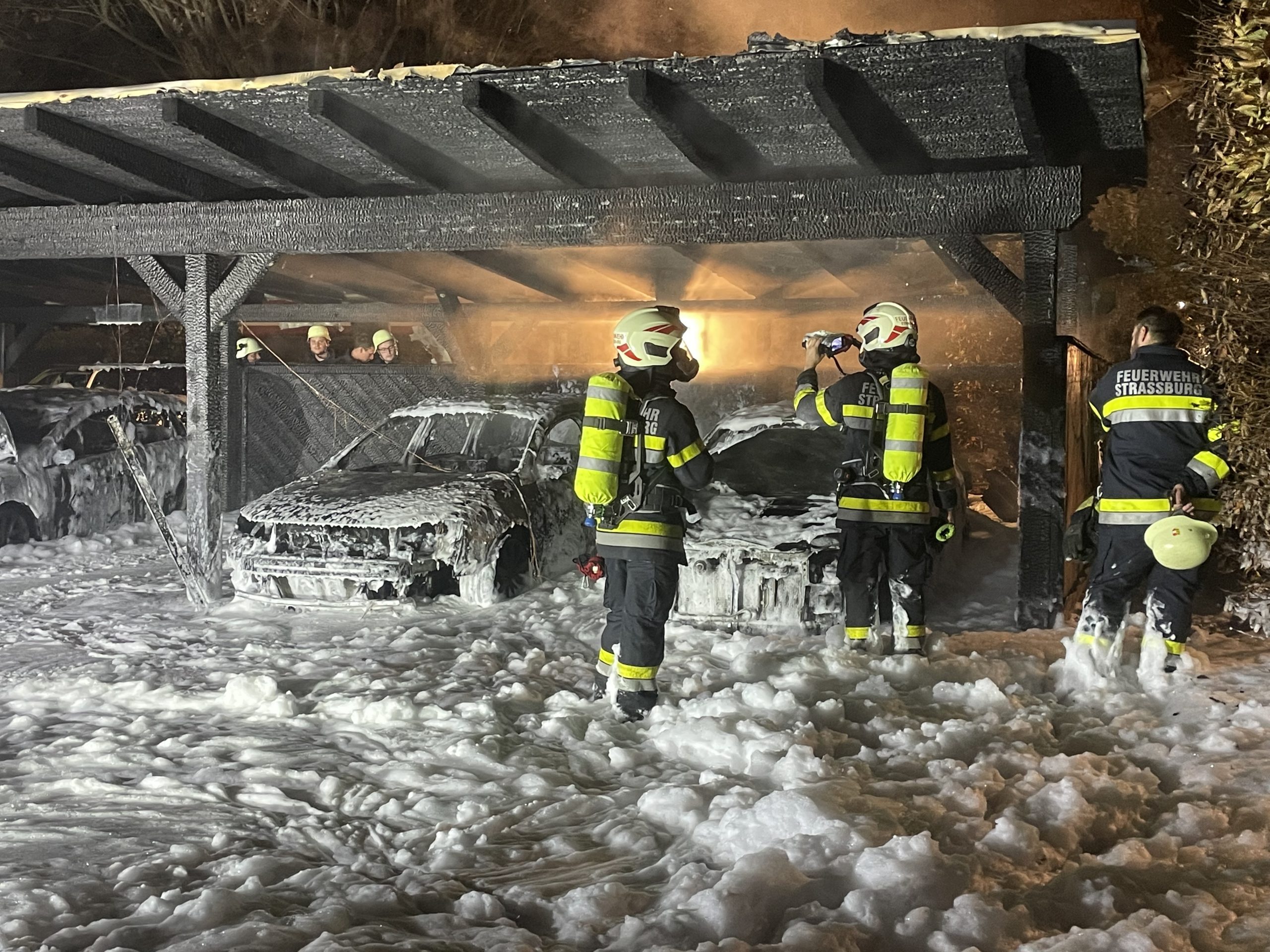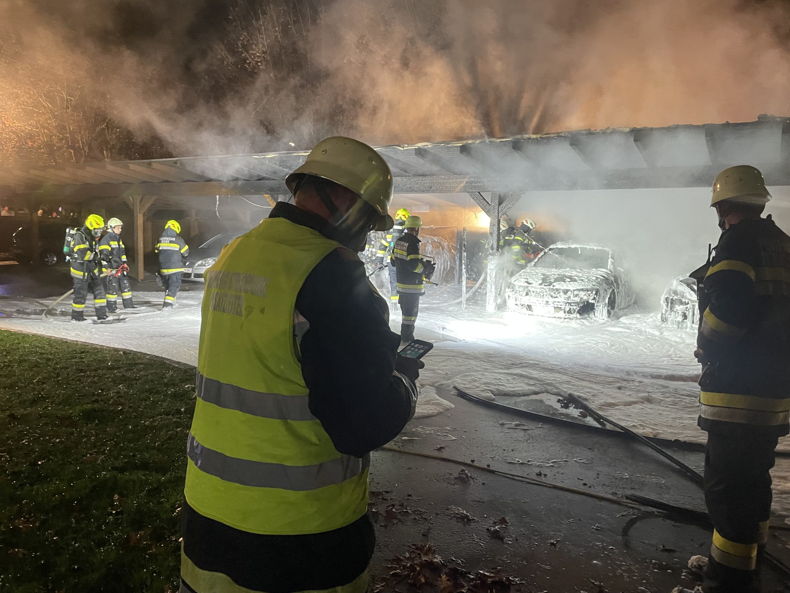 Aus unbekannter Ursache gerieten gestern Nacht mehrere PKW‘s in einem Carport nahe einer Gurker Wohnanlage in Brand. Nach Erkundung durch Einsatzleiter OBI Ralph NOTT wurde umgehend je ein Trupp mit schwerem Atemschutz der Feuerwehren Gurk und Straßburg in den Einsatz gestellt. Die Brandbekämpfung wurde mittels Hochdruck-Schnellangriffeinrichtung und Löschschaum durchgeführt. Mittels Zubringleitungen wurden die Tanklöschfahrzeuge von den Löschfahrzeugen gespeist. Das erforderliche Löschwasser wurde von diversen Überflurhydranten rund um den Einsatzort bezogen. Insgesamt brannten 3 PKW‘s vollkommen aus. 2 weitere wurden beschädigt. Zusätzlich wurde das Blechdach des betroffenen Carportteils entfernt um Nachlöscharbeiten vorzunehmen. Hauptaugenmerk lag auf dem Schützen des angrenzenden Gebäudes und der nahestehenden Fahrzeuge. Ein Übergreifen der Flammen auf die Wohnanlage konnte glücklicherweise verhindert werden.