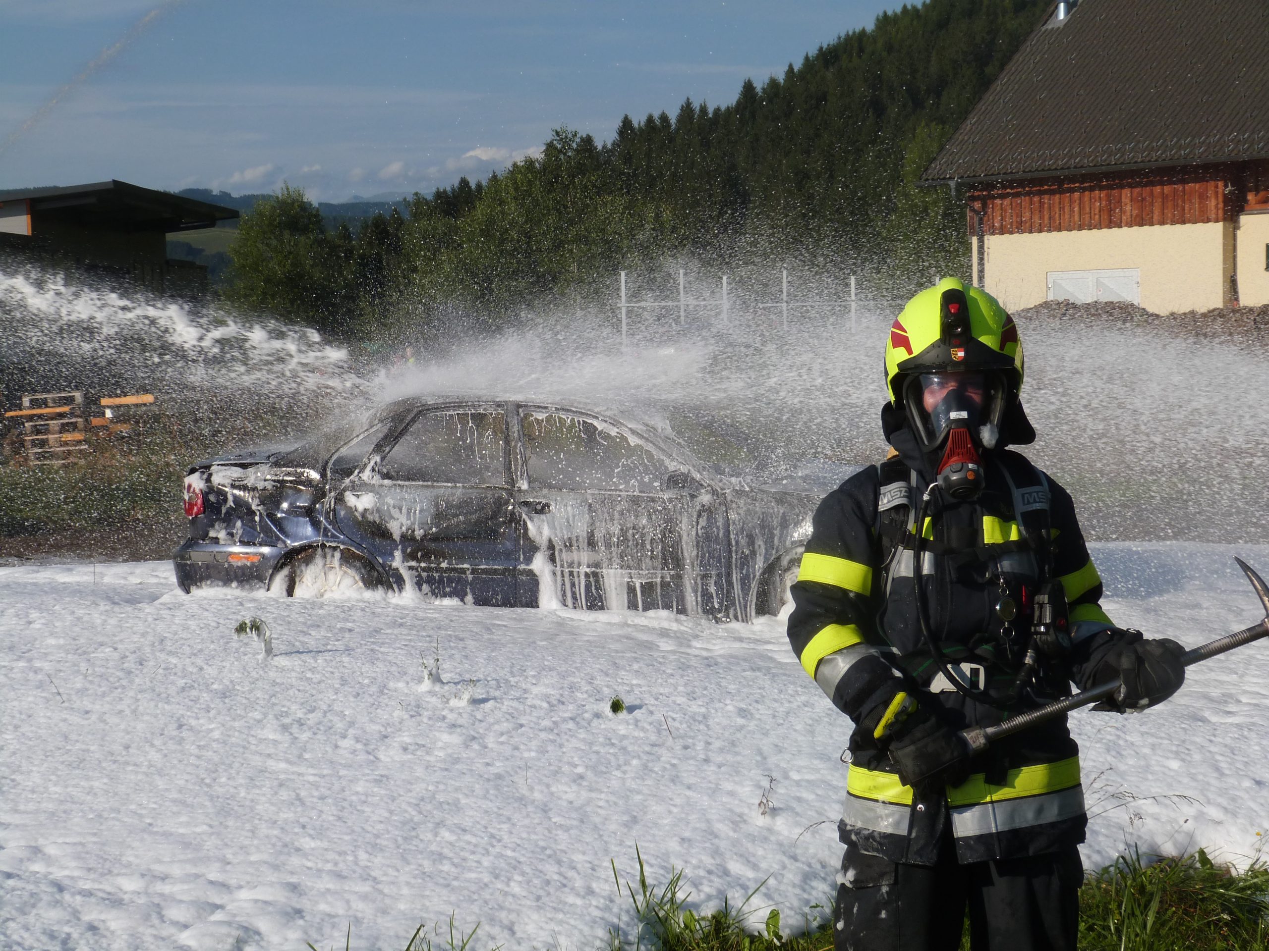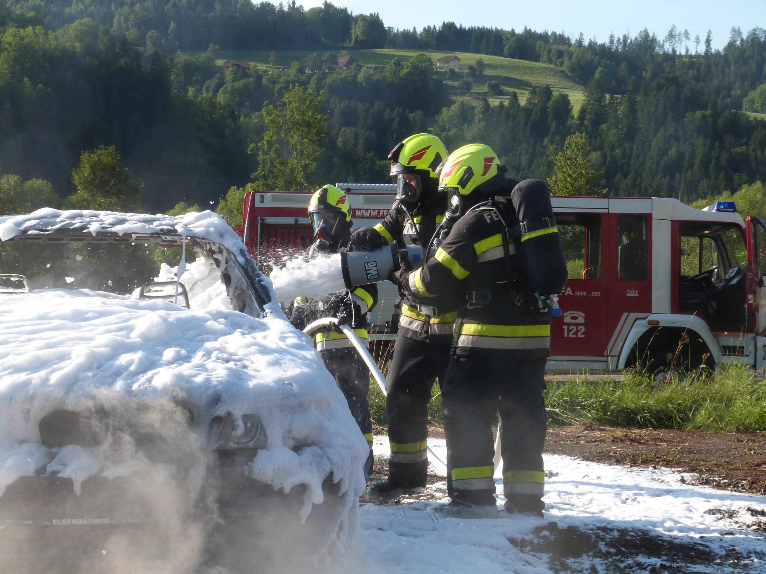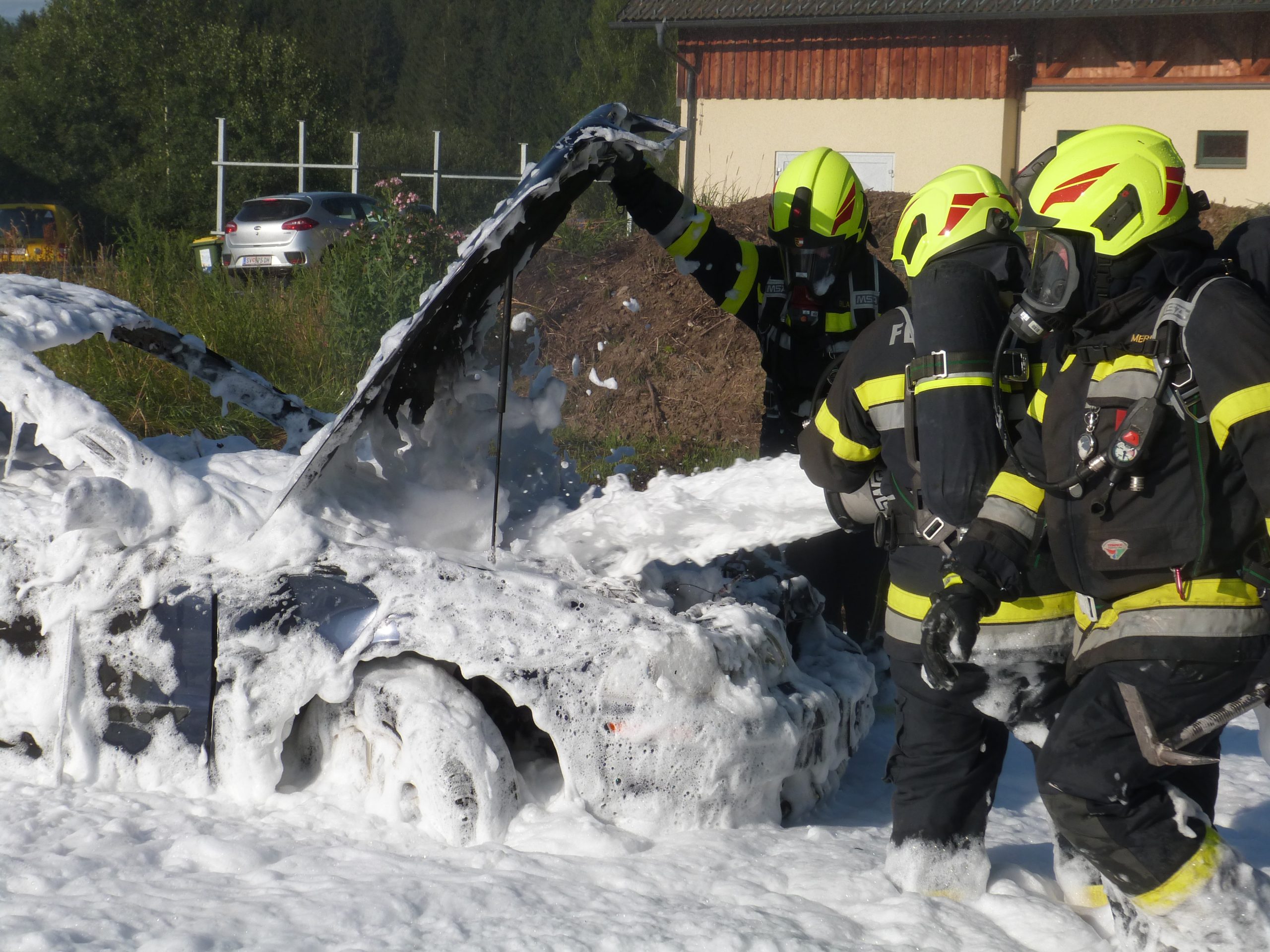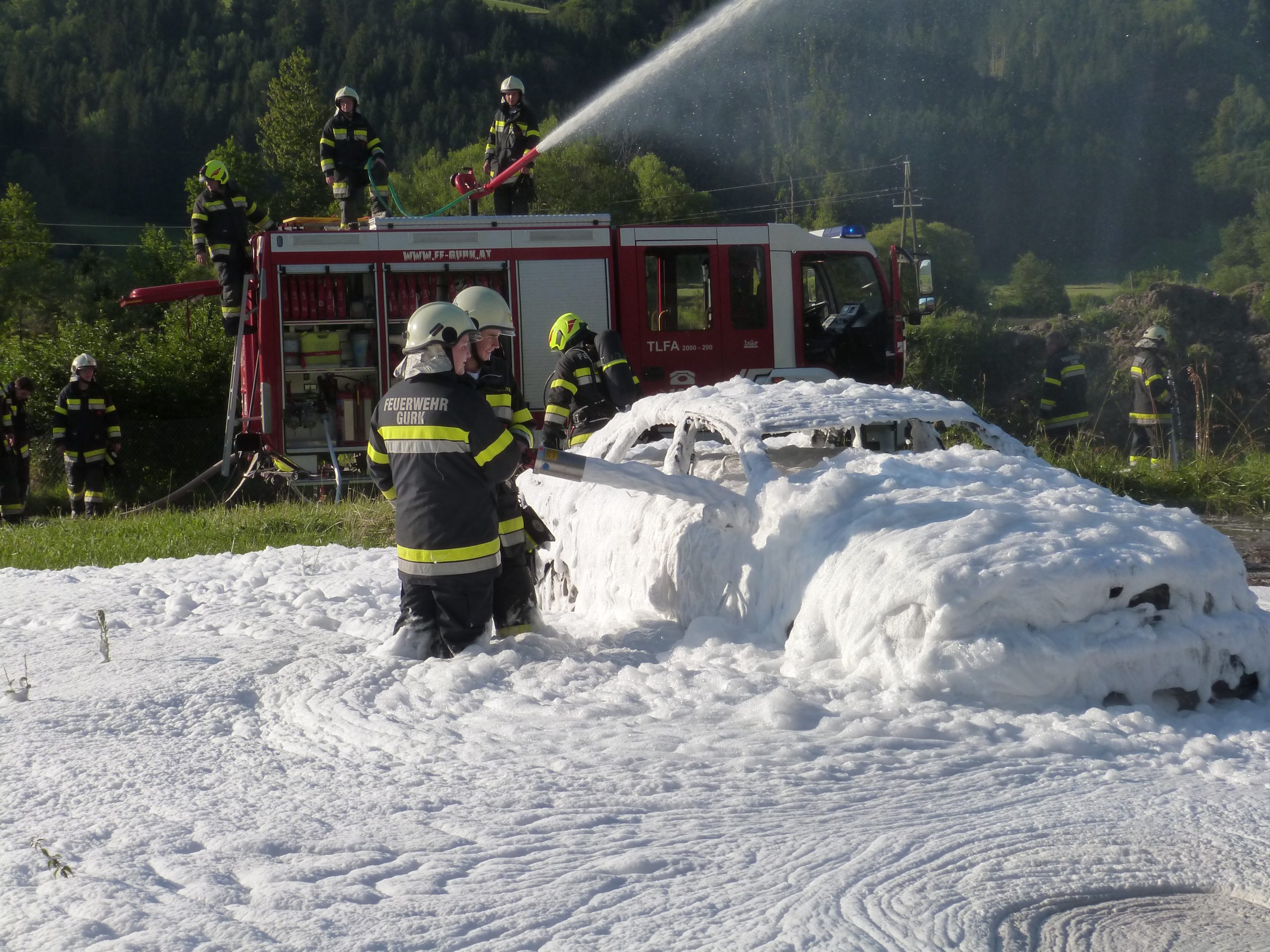 Unverzüglich rückten wir zum Einsatzort aus. Nach Erkundung durch Einsatzleiter KDT-Stv. BI Karl-Werner KRONLECHNER wurde ein Atemschutztrupp in den Einsatz gestellt. Mittels Schnellangriff des TLFA 2000-200 wurde das in Vollbrand stehende Fahrzeug gekühlt und die Brandbekämpfung eingeleitet. Die restliche Besatzung des TLFA brachte zudem ein C-Angriffsrohr, zum Schützen der umliegenden Gebäude, sowie den Wasserwerfer in Stellung. Außerdem wurde durch den Atemschutztrupp eine umfassende Brandbekämpfung mittels Kombischaumrohr durchgeführt.