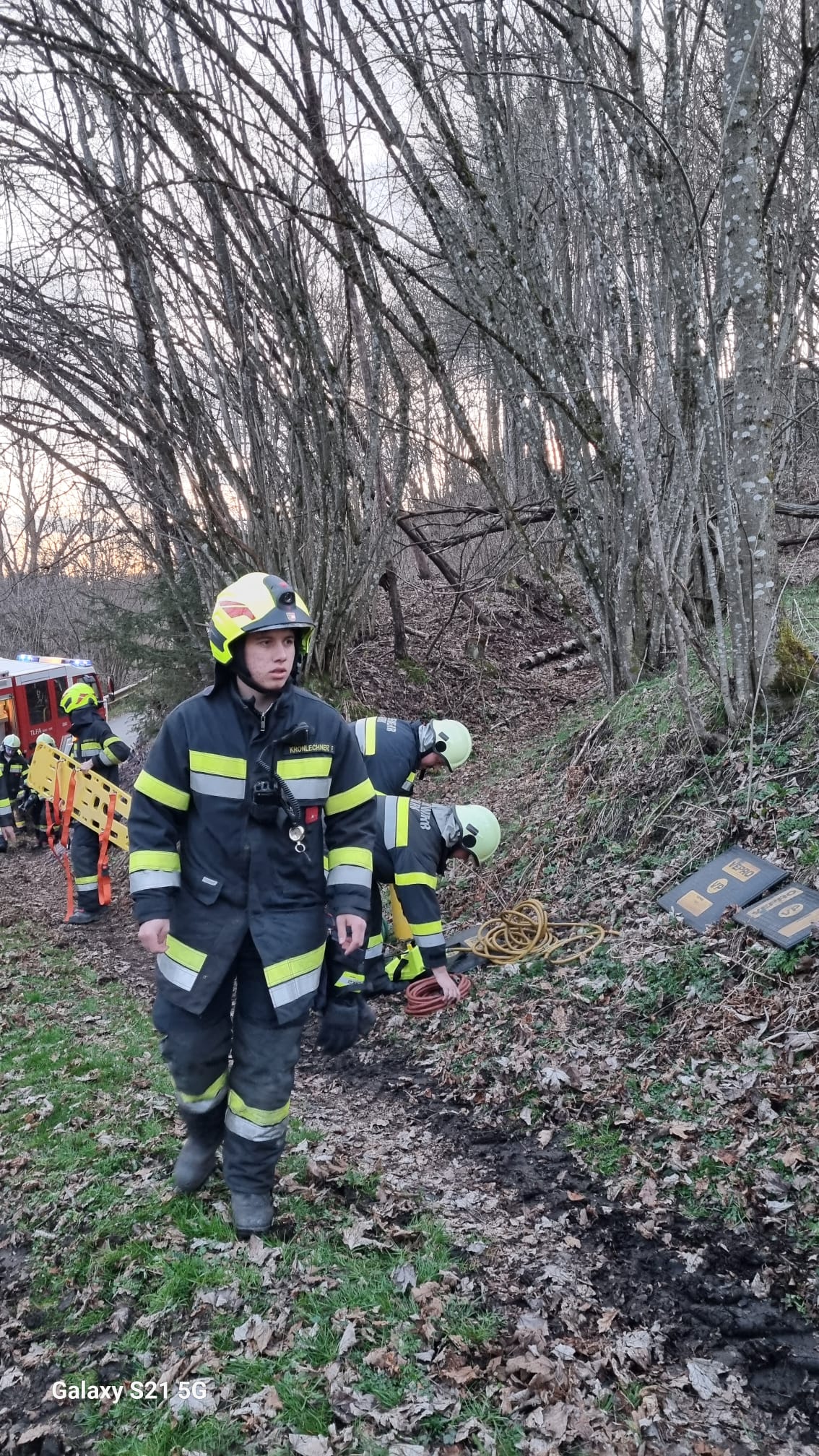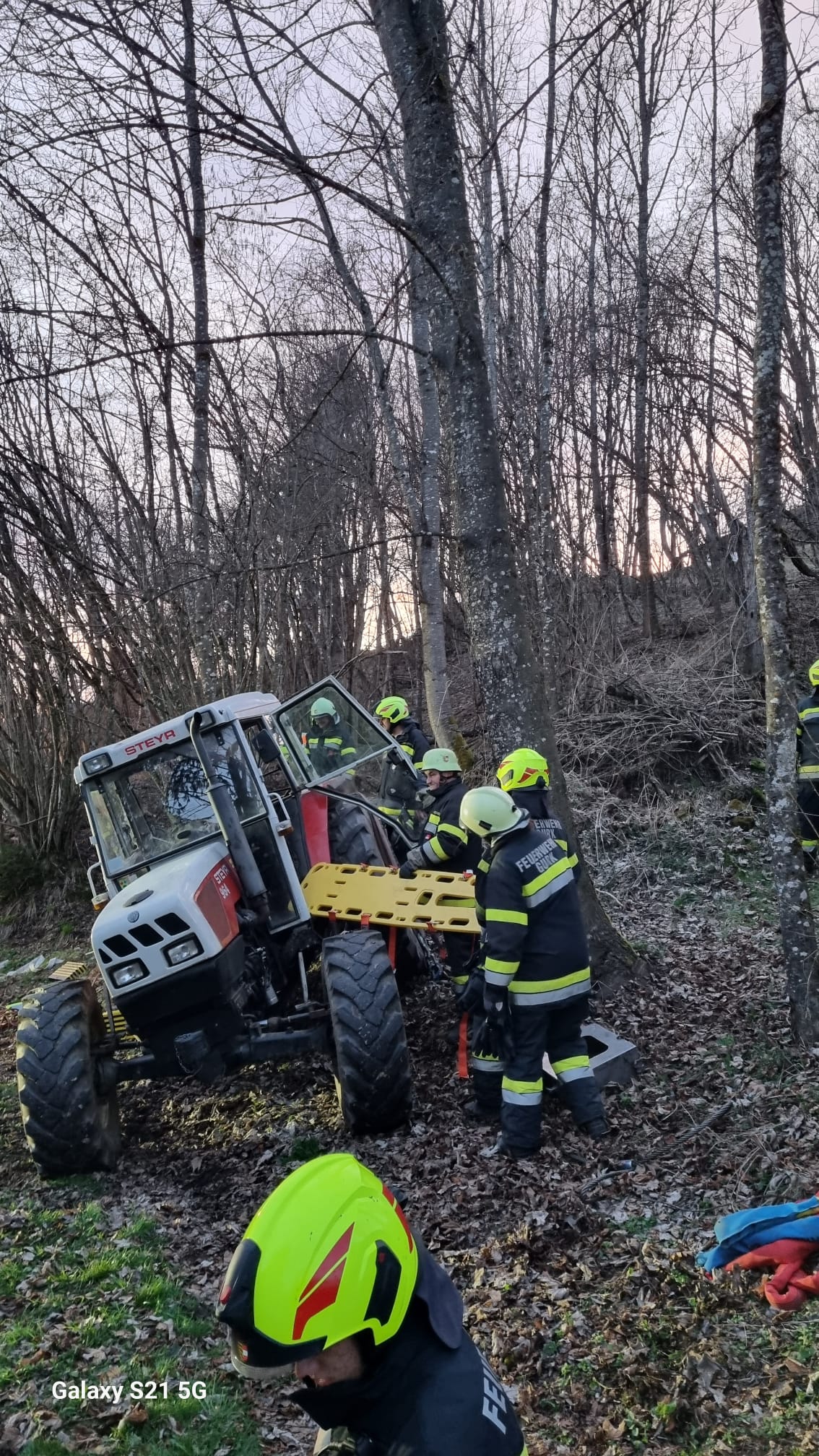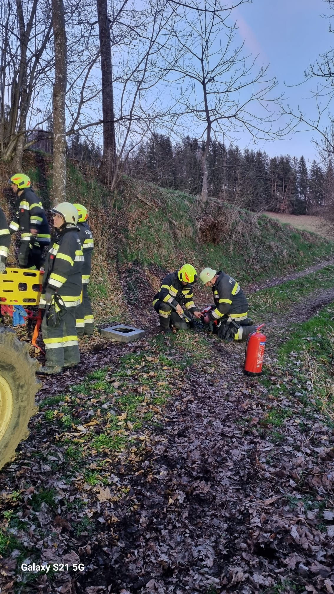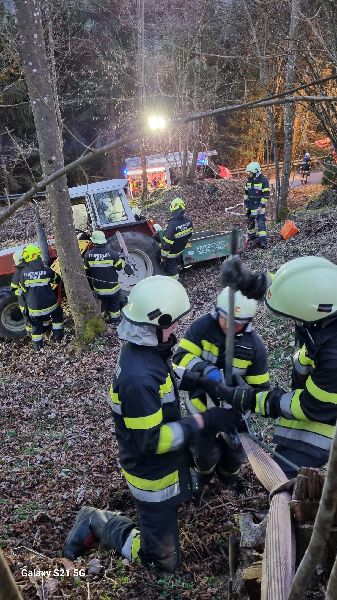 Unverzüglich rückten wir mit unserem TLFA 2000-200 und unserem LFA zum Übungseinsatz aus. Nach Erkundung durch Übungseinsatzleiter BI Karl-Werner KRONLECHNER stellte sich heraus, dass eine Person bei Forstarbeiten unter die Ladefläche eines Traktors eingeklemmt wurde. Zusätzlich musste eine weitere Person aus dem Führerhaus geborgen werden. Mittels Hebekissen und Greifzug konnte das Fahrzeug gesichert und die eingeklemmte Person rasch geborgen werden. Mittels Bergebrett wurde die zweite Person aus dem Führerhaus geborgen. Nach Betreuung der verletzten Personen konnten diese dem Rettungsdienst übergeben werden. Zudem wurde eine umfassende Beleuchtung aufgebaut und auch das Ausleuchten eines Hubschrauberlandeplatzes simuliert. Weiters wurde mittels einem C-Angriffsrohr und einem Feuerlöscher ein zweifacher Brandschutz aufgebaut.